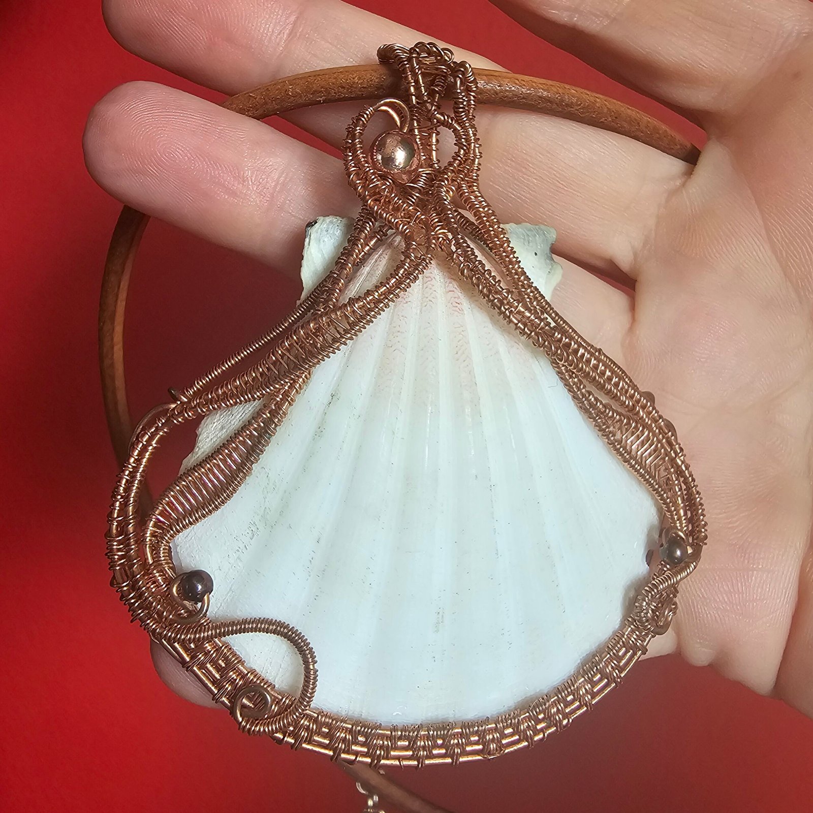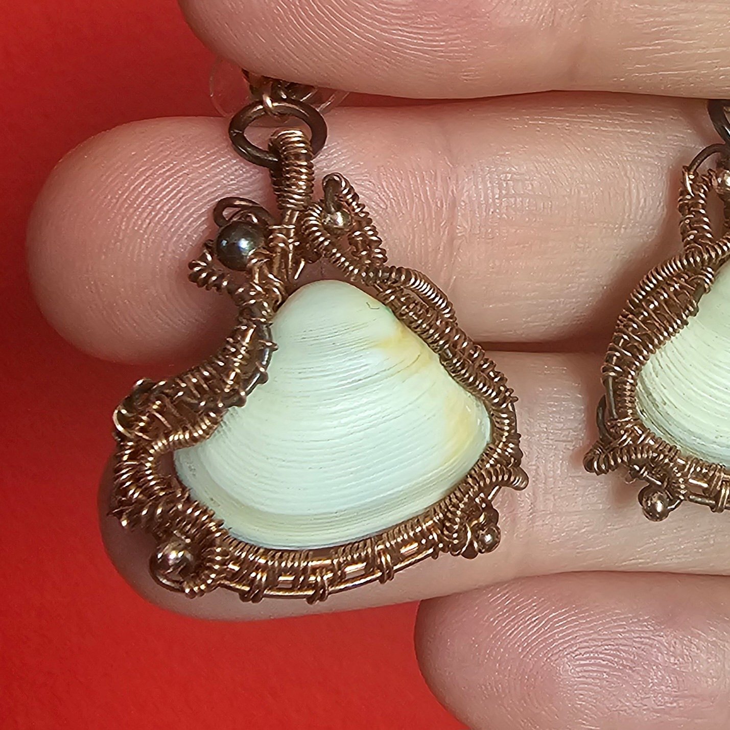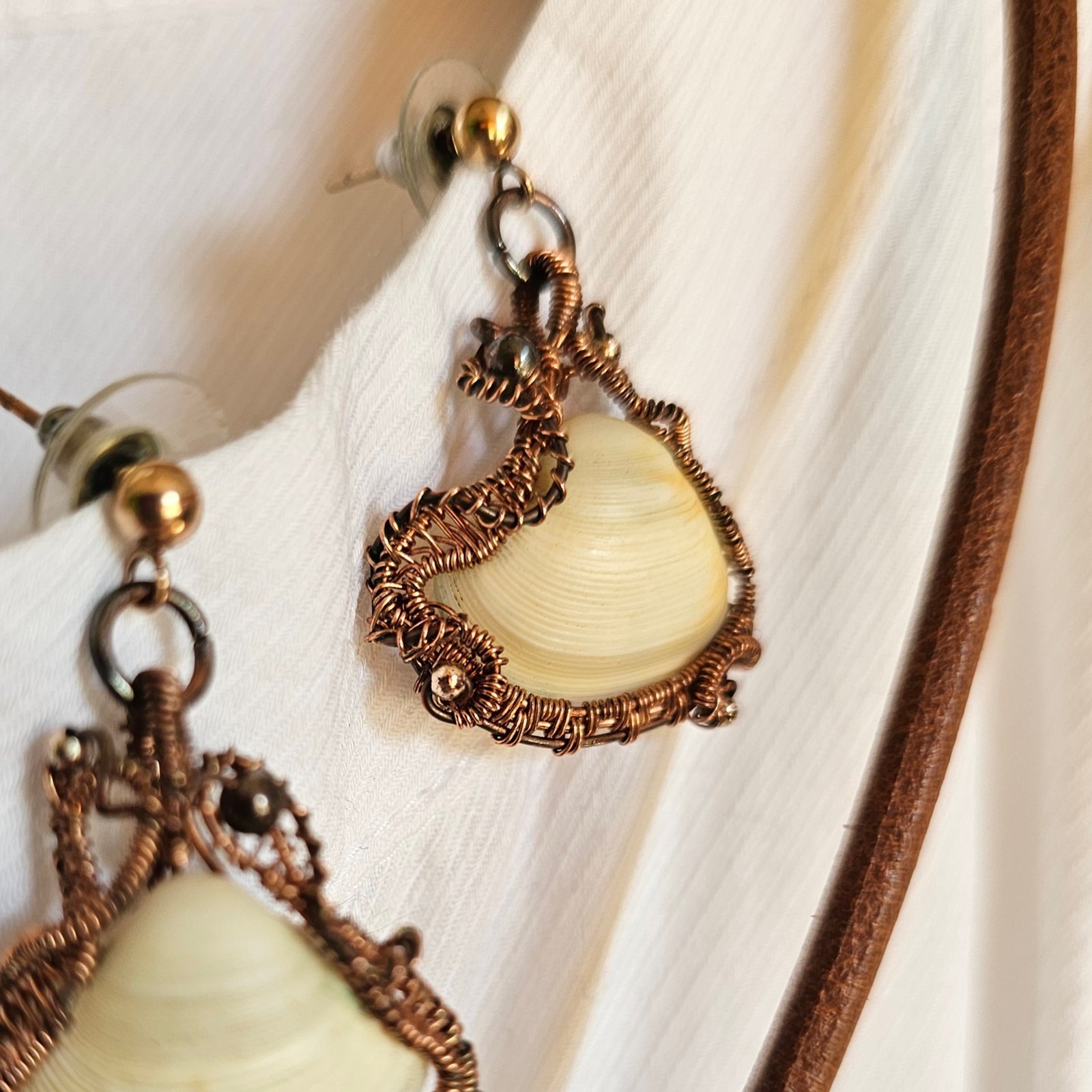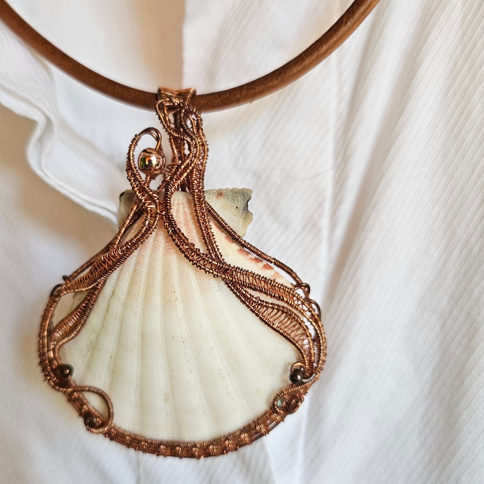 Wyjątkowy komplet biżuterii z miedzi, który łączy w sobie naturalne piękno i artystyczną precyzję wykonania. Naturalna muszla oprawiona ręcznie drutem miedzianym. Do zestawu dołączone są dopasowane kolczyki, tworzące spójną i elegancką całość.