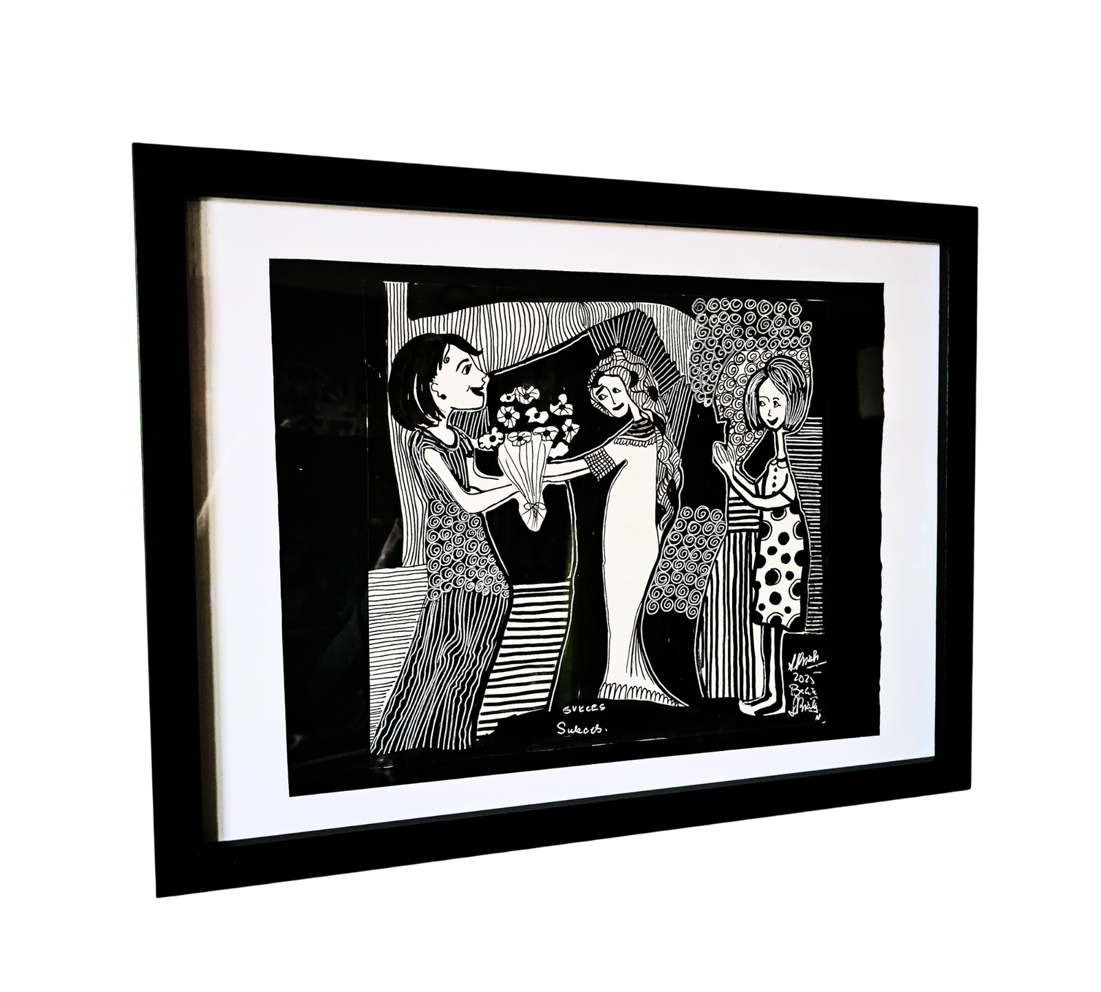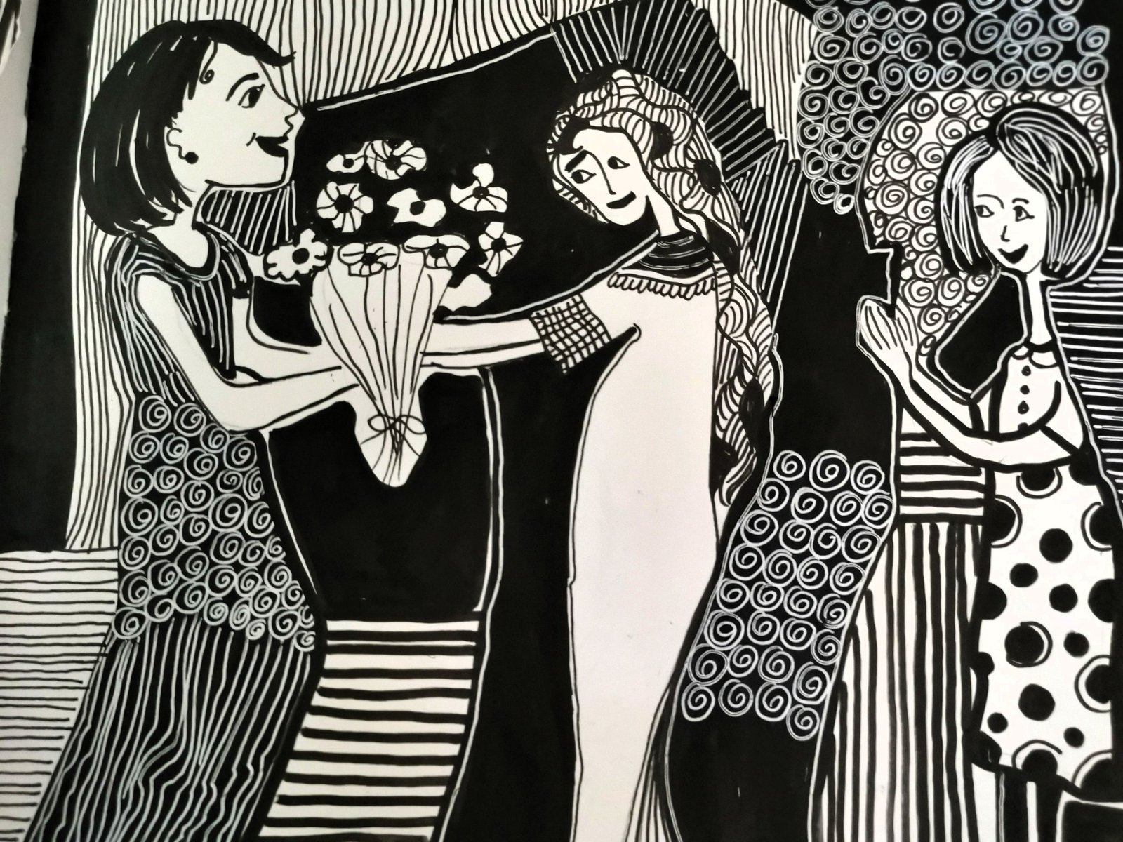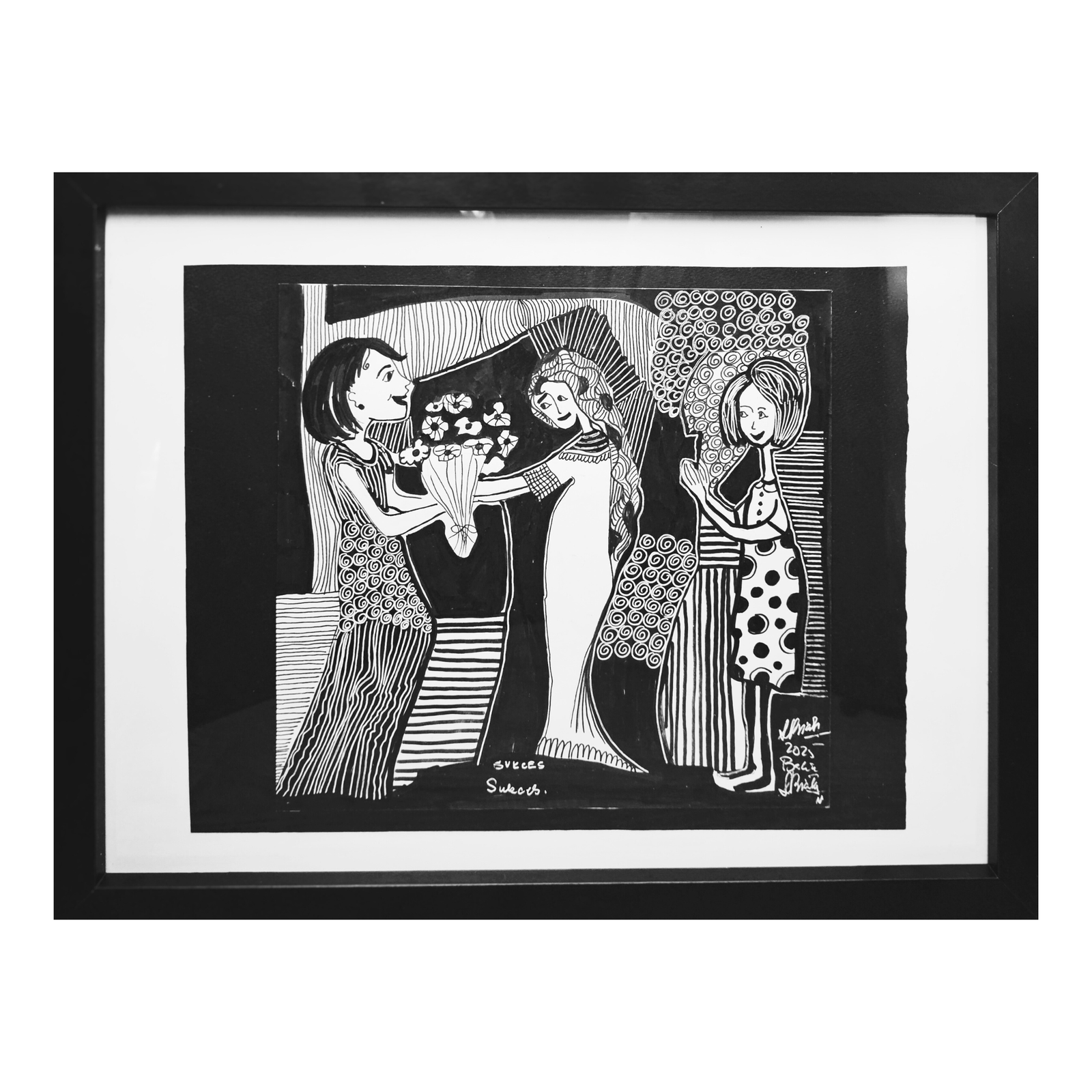 Praca wykonana czarnym tuszem i flamastrami na białym papierze.