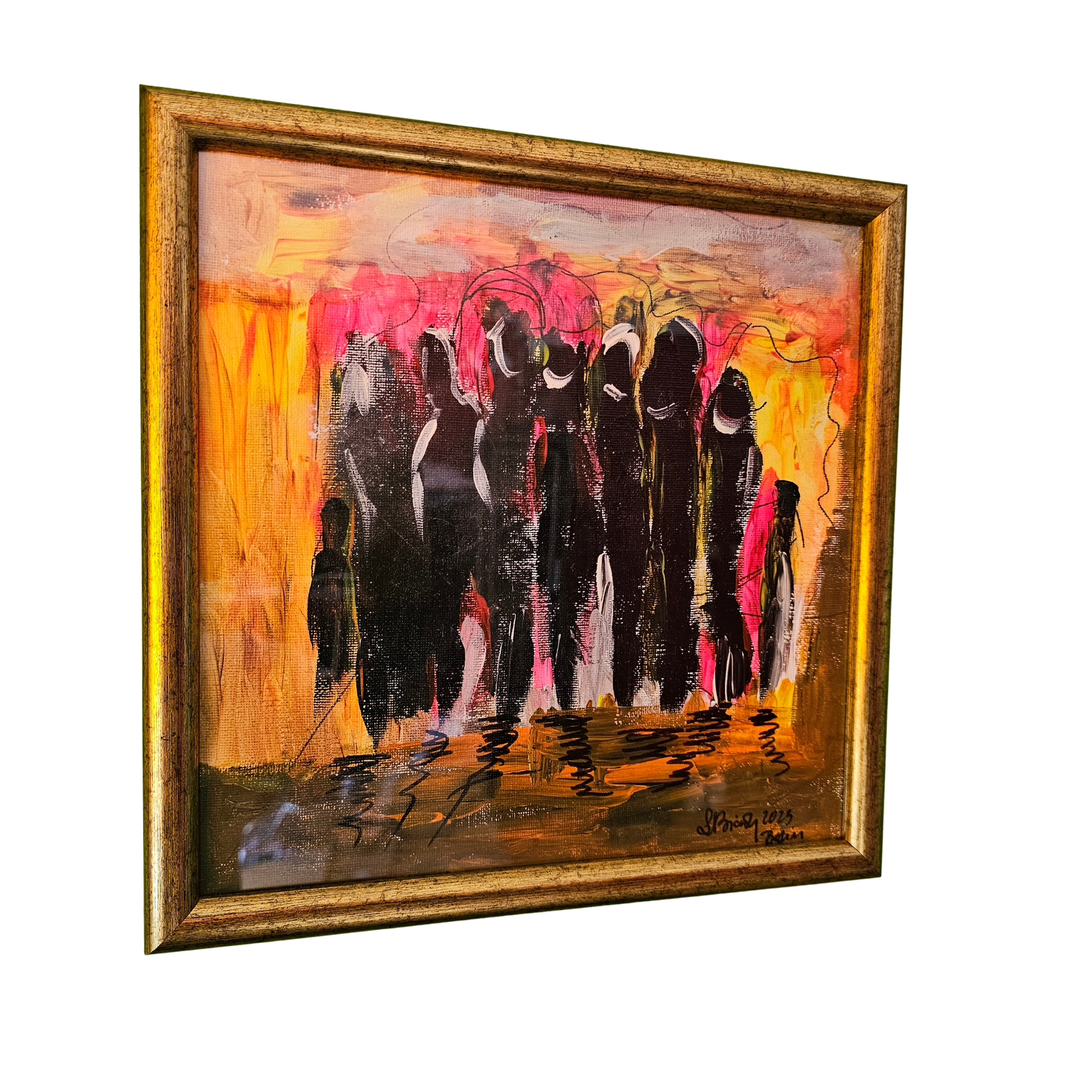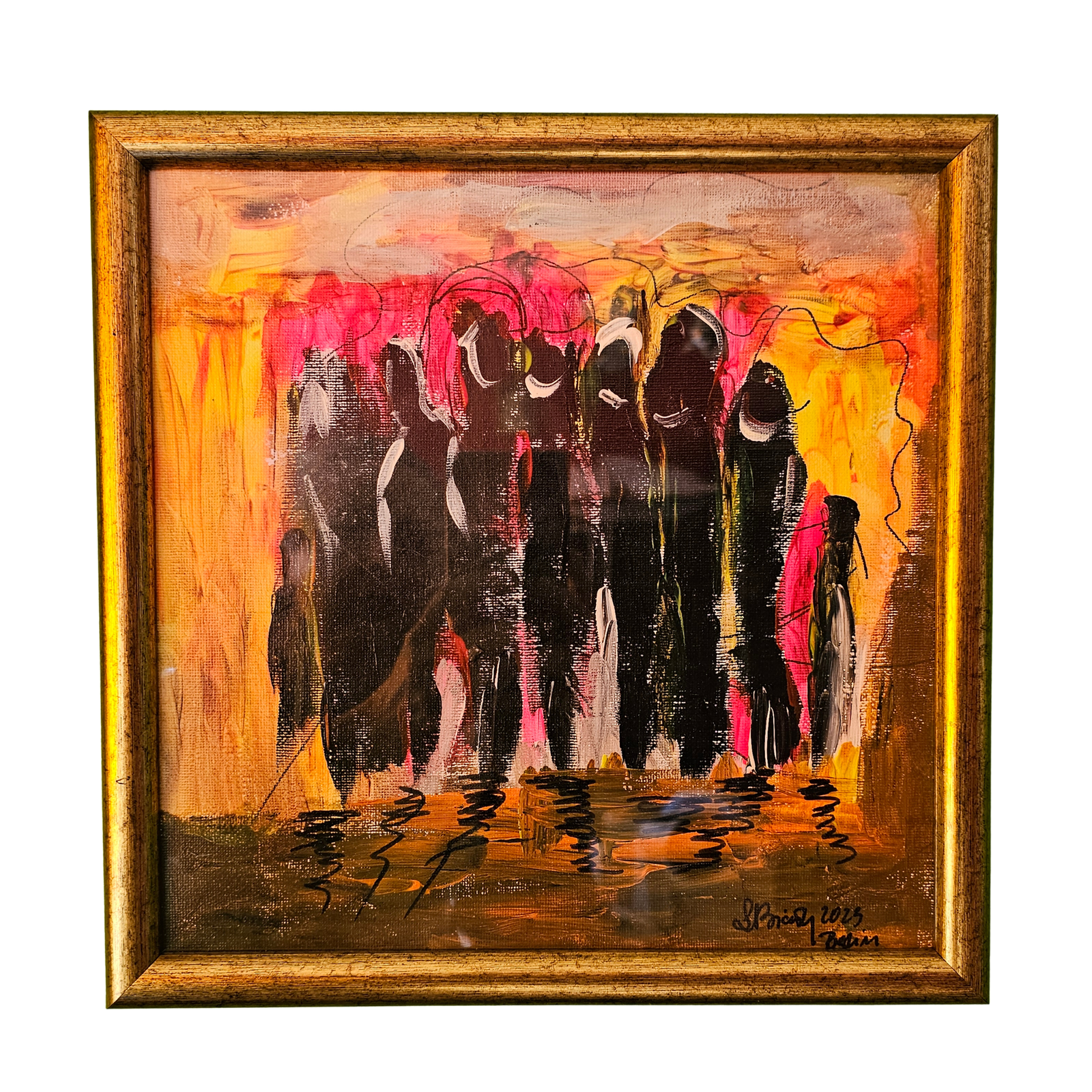 Praca wykonana akrylem na kartonie, oprawiona w drewnianej pozłacanej ramie.